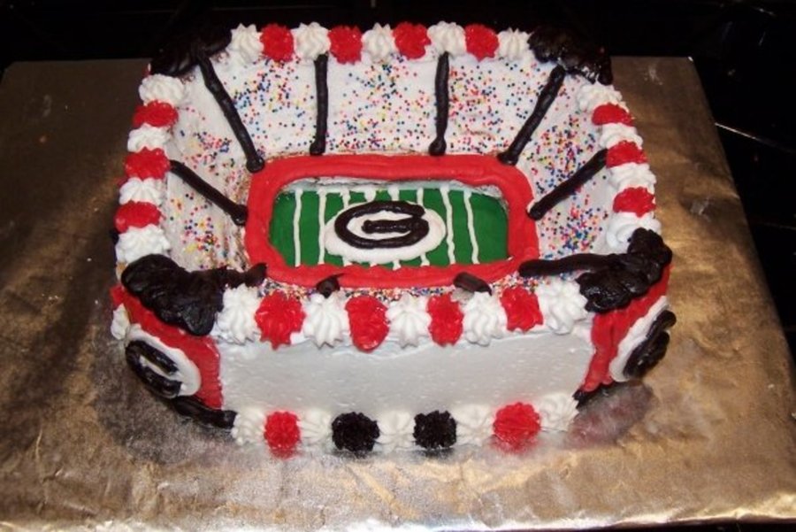 This is a football stadium cake decorated with the University of Georgia colors. Used non-pareils for the "fans." The cake pan is made by Nordicware, and is in the shape of a stadium.