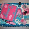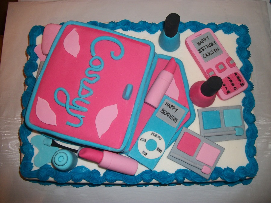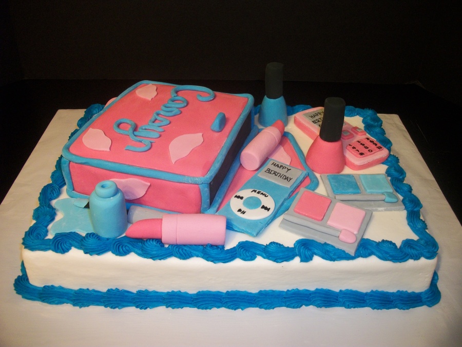 Did this for a 6 year old who was having a little girls spa party. Her mother said she wanted lots of makeup on the cake. I came up with this. It was a hit. The cake is 1/4 sheet cake covered in BC. The purse is cake covered in fondant. All the makeup is made with fondant.
