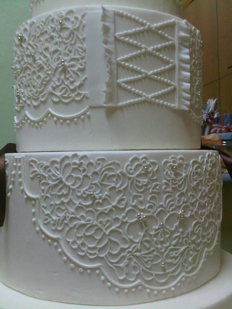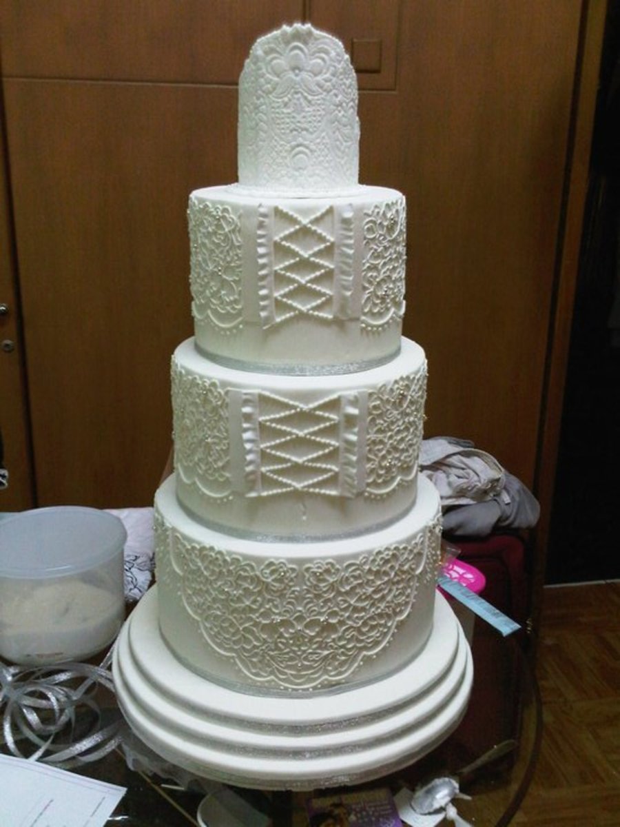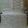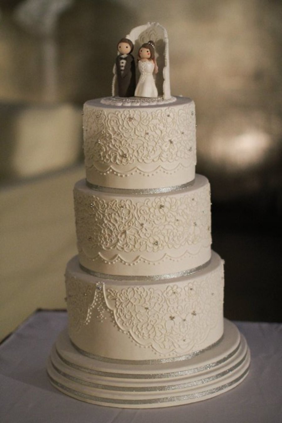 Three tier cake dummies covered in white fondant with hand piped royal icing lace. Figurines and background are gumpaste..