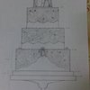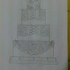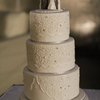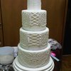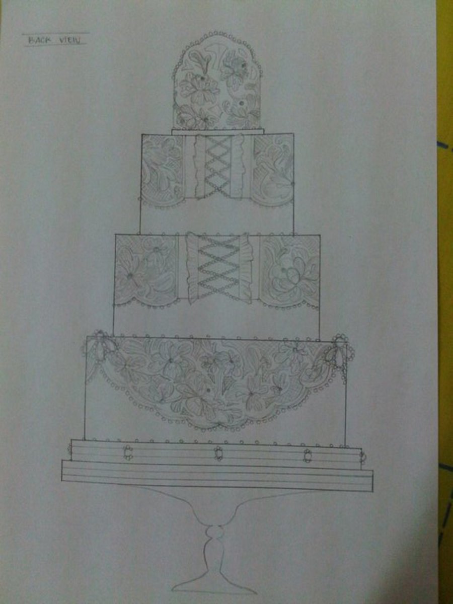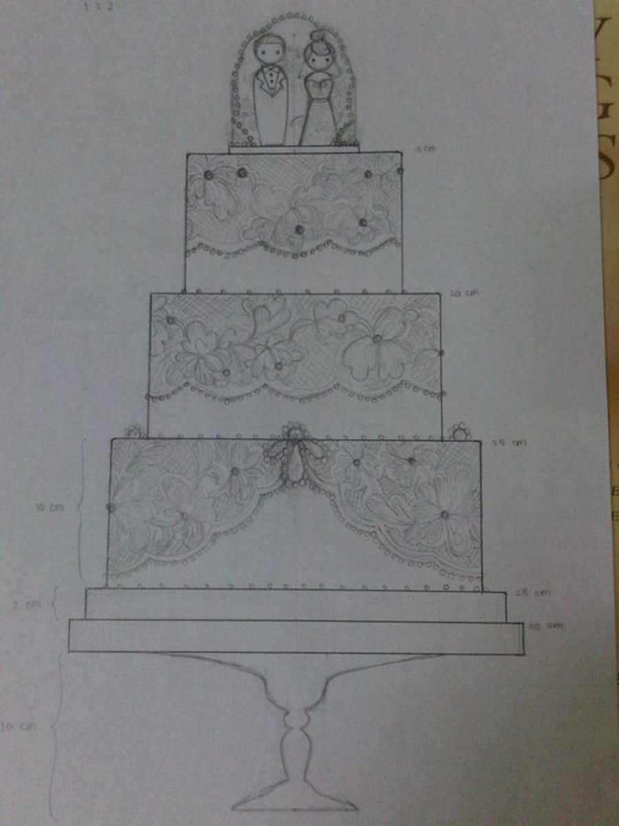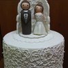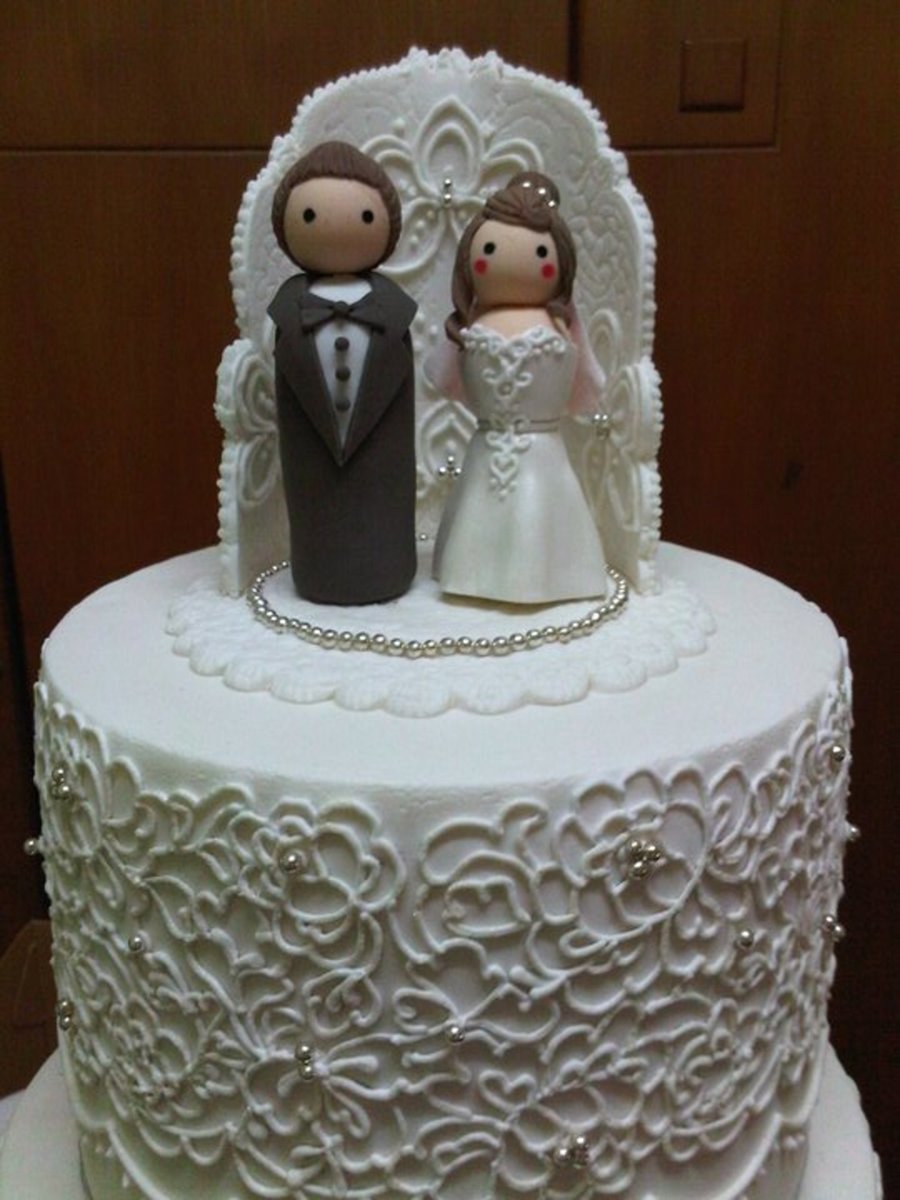Three tier cake dummies covered in white fondant with hand piped royal icing lace. Figurines and background are gumpaste..