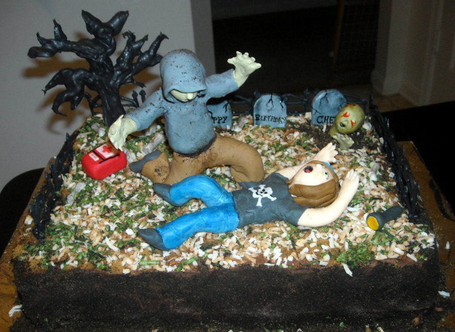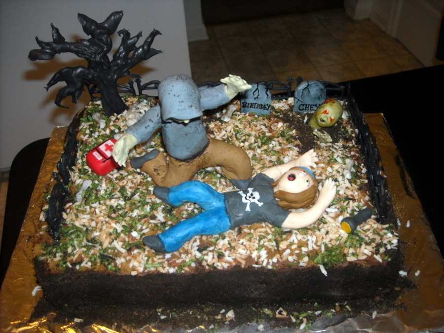 Birthday cake for a 12 year old girl obsessed with left 4 dead video game. Her favorite character is "hunter". She asked to have him in a graveyard scene. I added a figurine that looks like her. This one was a lot of fun. TFL!