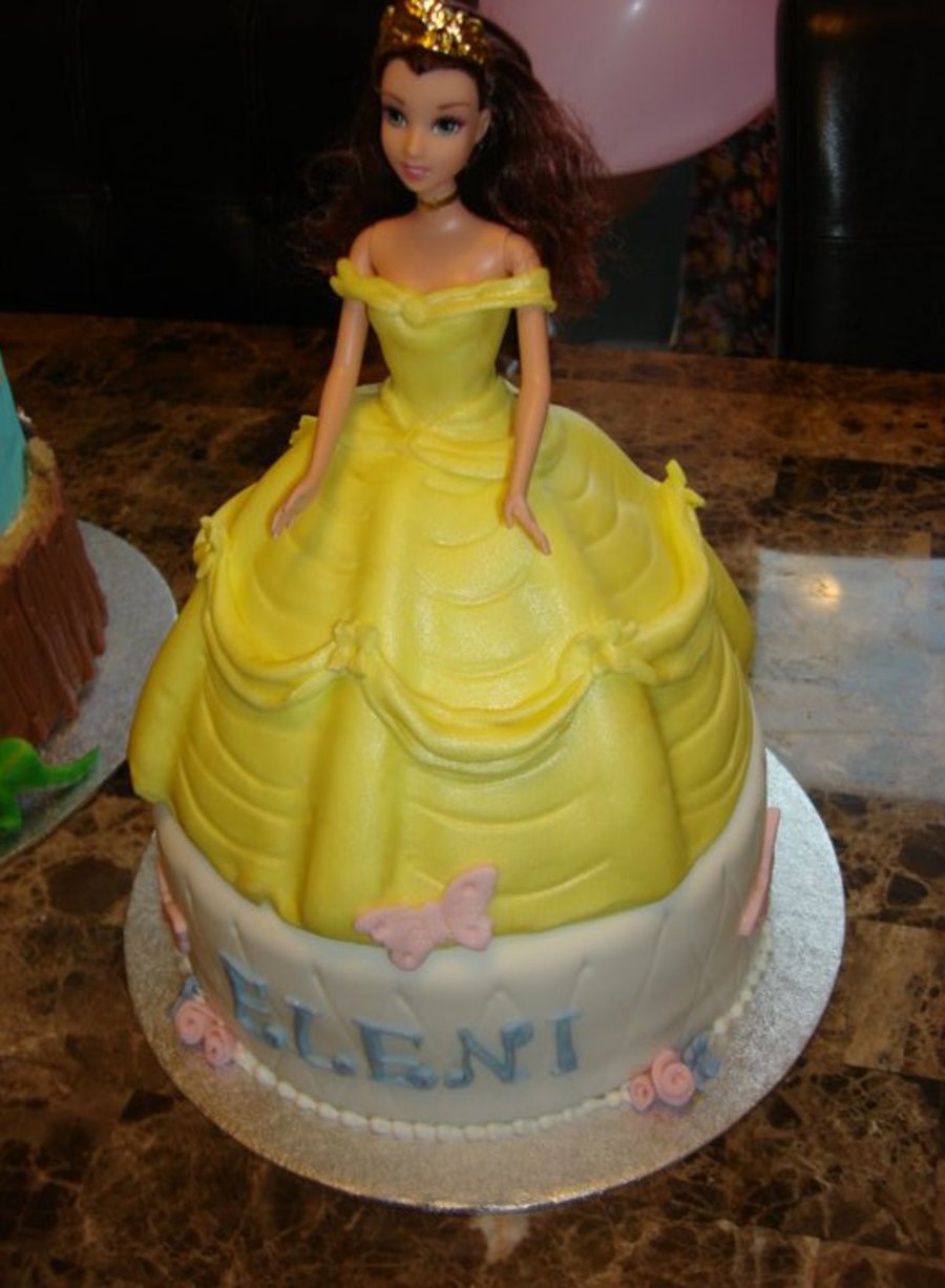 all fondant, rice krispy skirt, actual belle doll inserted into krispy down into skirt