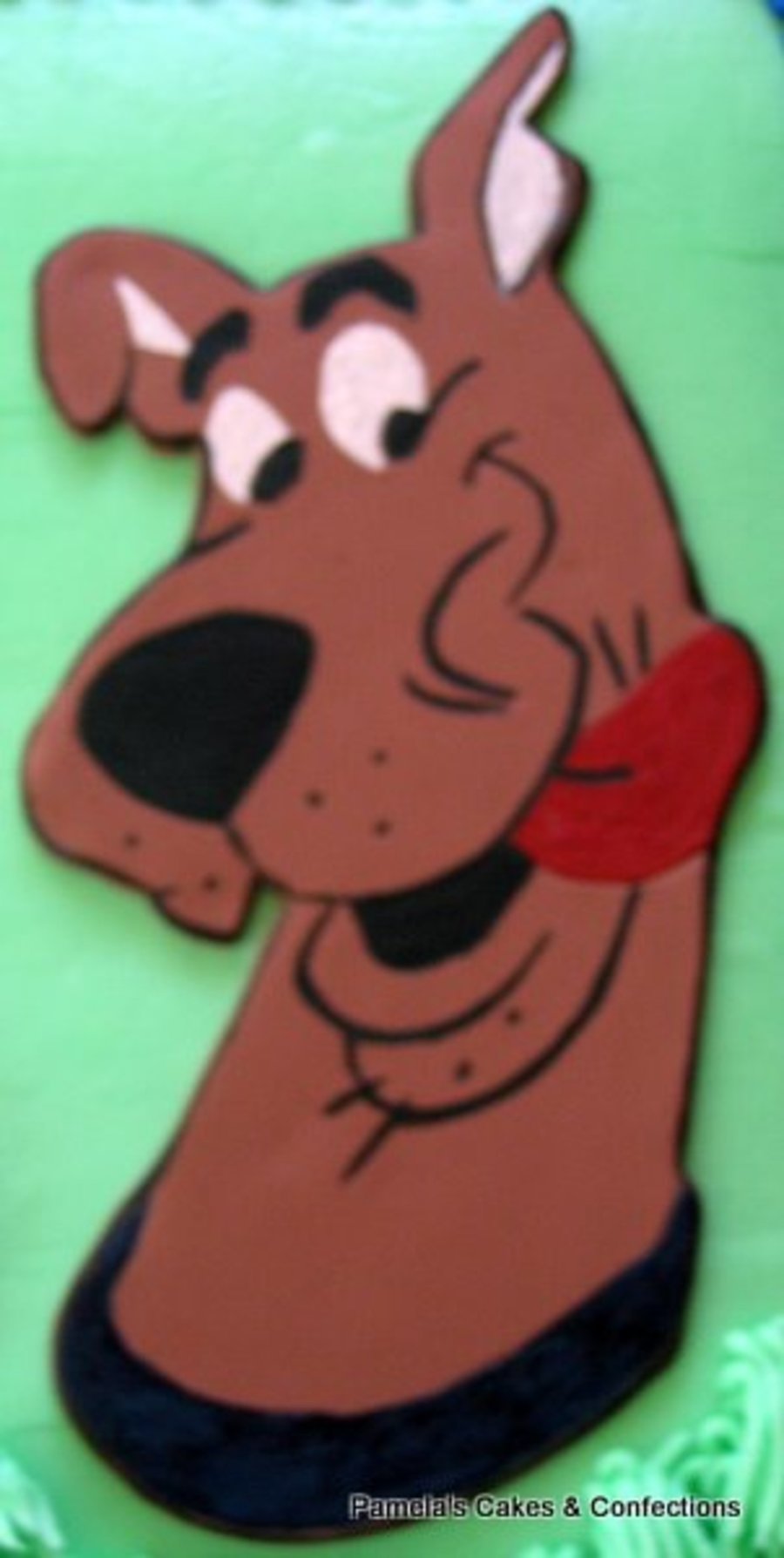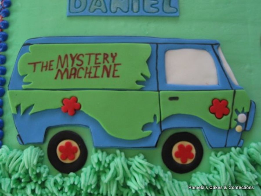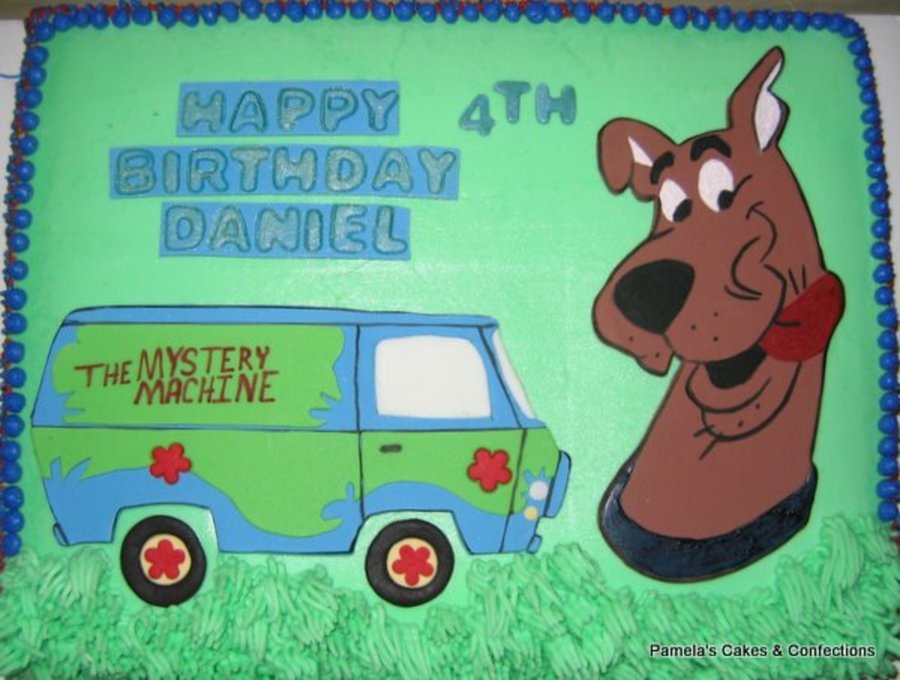 Scooby Doo birthday cake for my great-grandson, Daniel's 4th birthday party. Almond flavored yellow cake with almond flavored buttercream. Custom made Scooby Doo and Mystery Van from fondant/gumpaste.