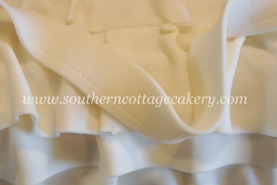 This is another cake I made for a photo shoot for the local paper. I designed the purse after one I would actually like. Haven't found it yet, but maybe someone can make it for me! Anyway, the cake is a pound cake that I carved in the shape of a purse and then cut strips of ivory fondant a ruffled it starting at the bottom and worked my way up. The flower is fondant with a center made from edible glitter.