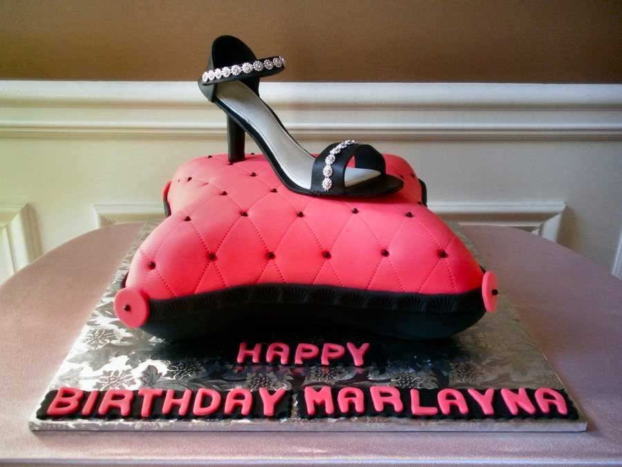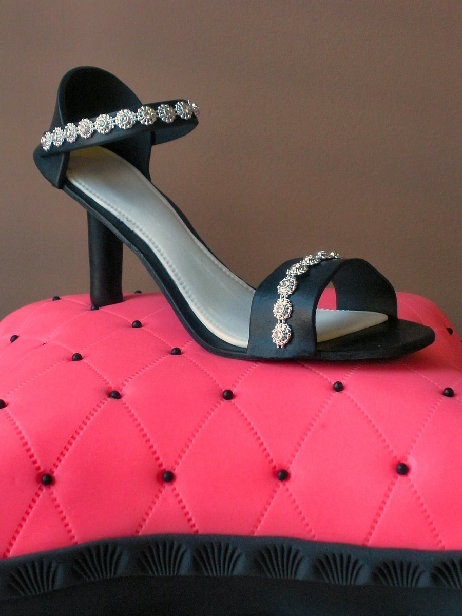 This is a 10" pillow made from the Wilton Pillow Pan. It is covered in fondant. The shoe is also made of fondant. The jewels on the shoe are not edible.