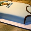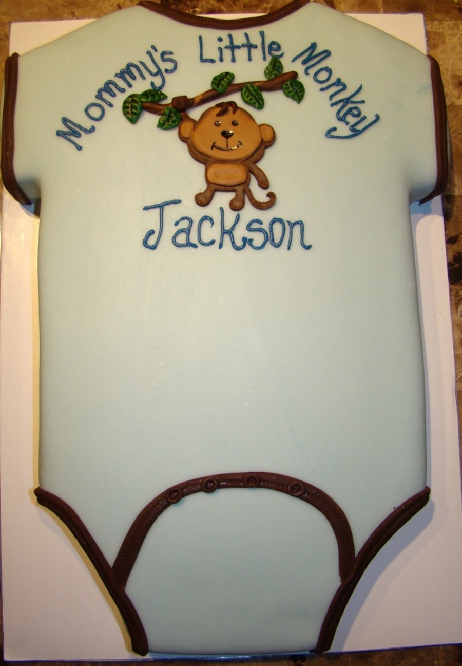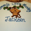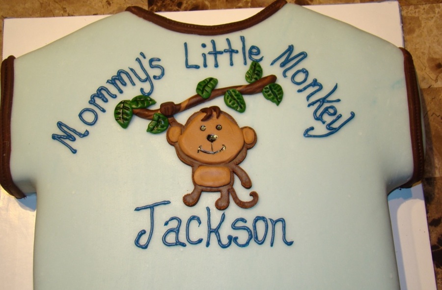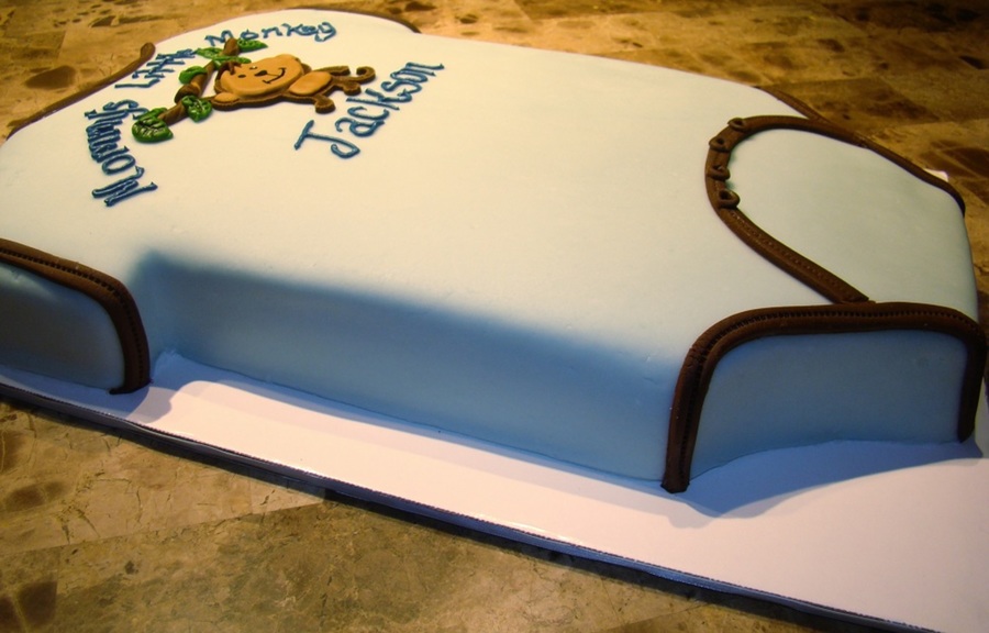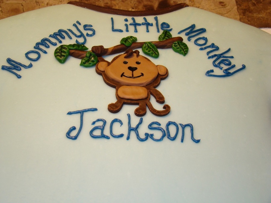 This was a quick little cake carved out of an 11*15 inch white cake for a co-worker's baby shower. The cake was covered in light blue mmf with mmf accents in varying colors. The MMF monkey accent was cut using the create a critter cartridge and the cricut cake machine.