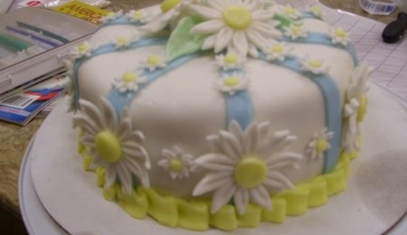 Cake was so fun for a mom having triplets. Two boys and one girl. Covered in fondant. Fondant details. I made the baby peanuts out of candy clay from peanut butter flavored candy discs that did not contain nuts (she had a peanut allergy). I loved how it turned out.