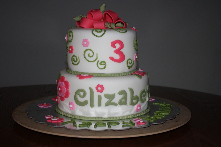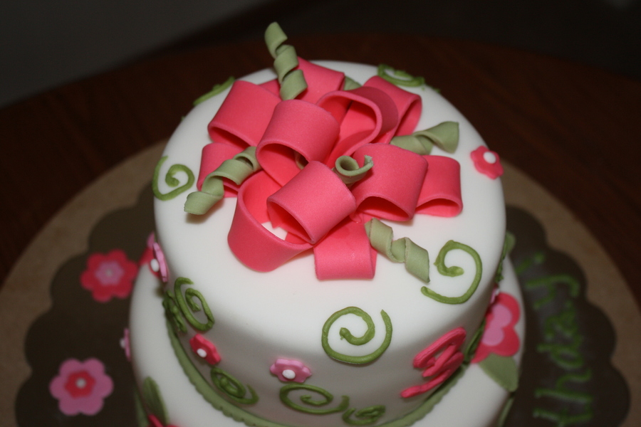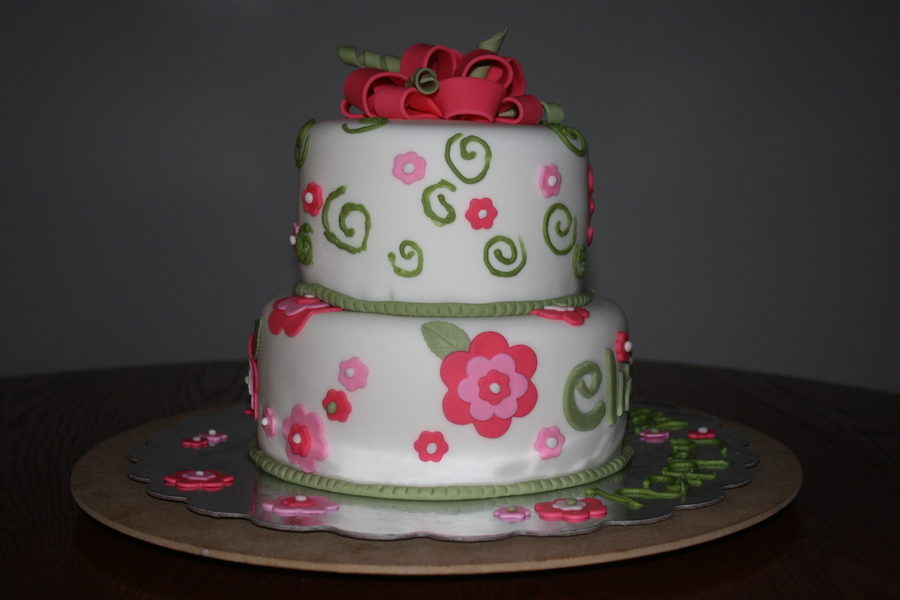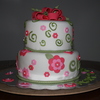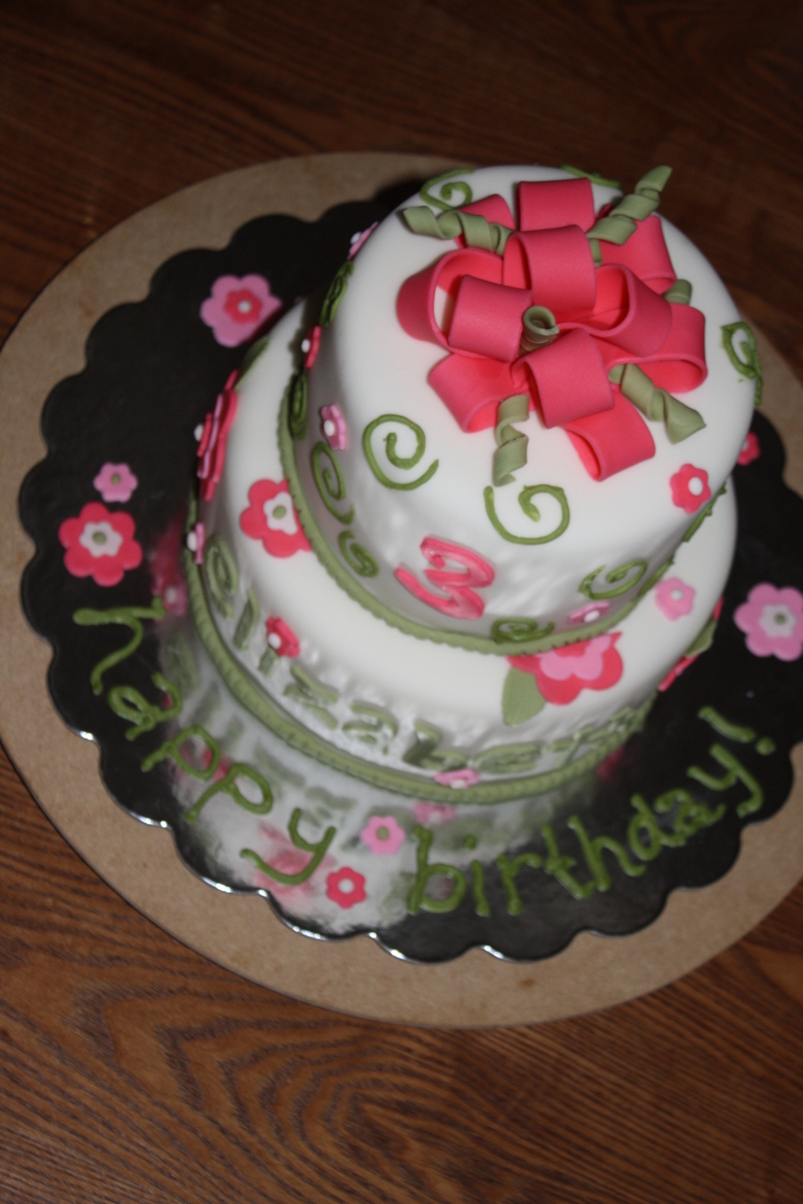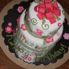 My daughter wanted a cake with pink flowers and with the help of ideas from cake central, this is what we came up with. Cake is chocolate w/ chocolate bc and yellow cake with marrachino cherry bc (turned out yummy!).