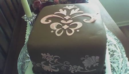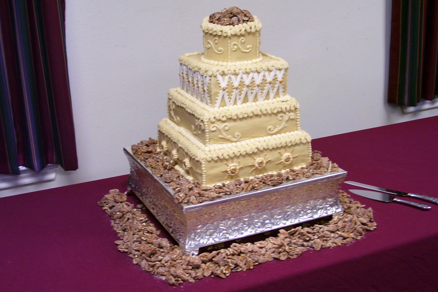 This cake was made for a reception honoring a man that was moving to a new job. The additional photo shows the cake before it was delivered and the sugared pecans were added. The lighting shows more details.