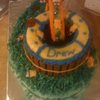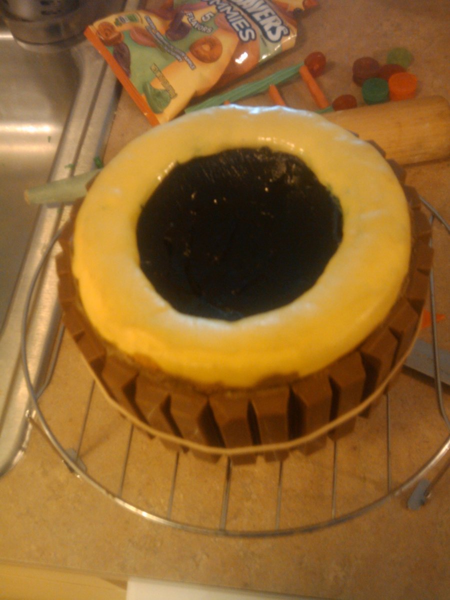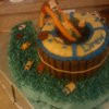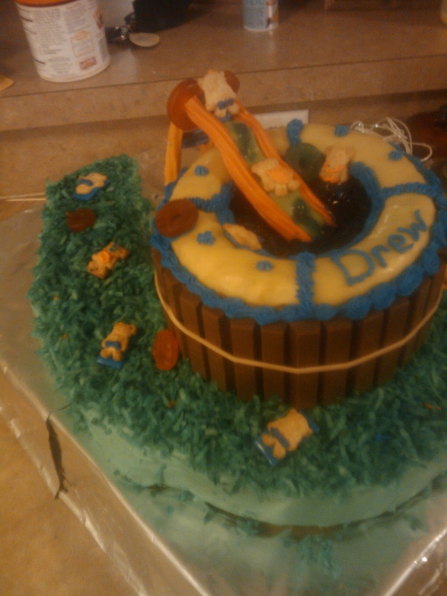 I made this for my son for his 6th birthday. He wanted a pool cake since he got a pool party. MAde the base a number 6 for his age followed with a two layer 6in cake in the center of the 6 for the pool. I dug out the middle of top layer of the 6in and made jello jiggler in the same size. rim around top of pool is starburst and around sides of pool is kitkat bars. Coconut grass, teddy grahm people, starburst towels and starburst slide