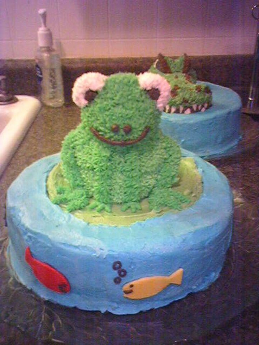 The base is an eight inch round with buttercream watter and lillypad with fondant fish. The frog is a small bear mold with buttercream stars.