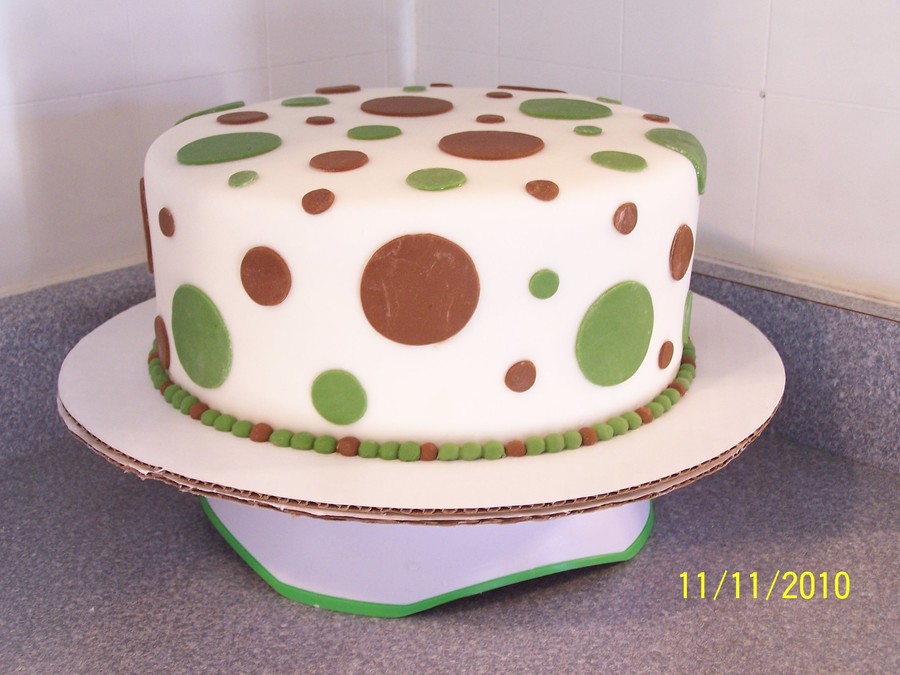 8" cake covered in mmf. Brown and dk green polka dots. Just a simple cake. They didn't want anything on top of it.