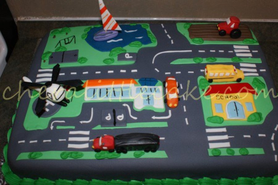 I have been making cakes for this family for awhile so she likes to come up with cakes that mean something. He little boy has a hugh floor play mat and all the cars and trucks to go with it. So she wanted me to make a cake to look like one of those mats.