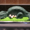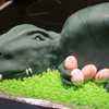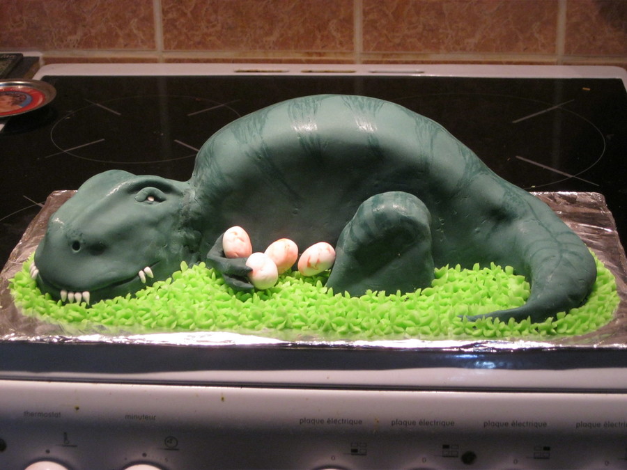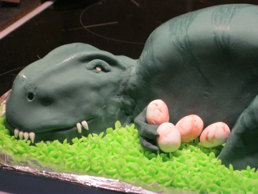 Picture of dinosaur cake in progress - problems with icing sugar used to roll out royal icing leaving marks