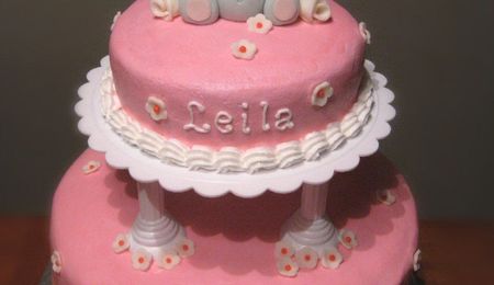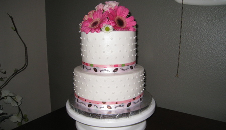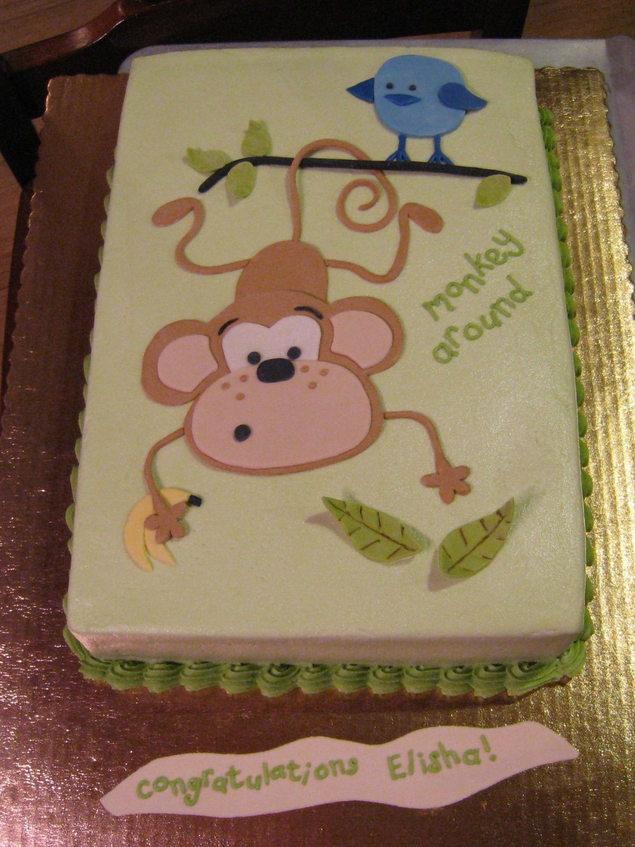 White sour cream pudding cake with bavarian cream filling, b/c frosting, fondant decorations. I matched it to a baby blanket for a jungle-themed nursery.