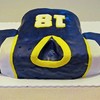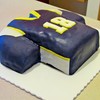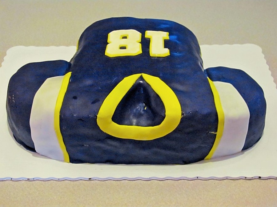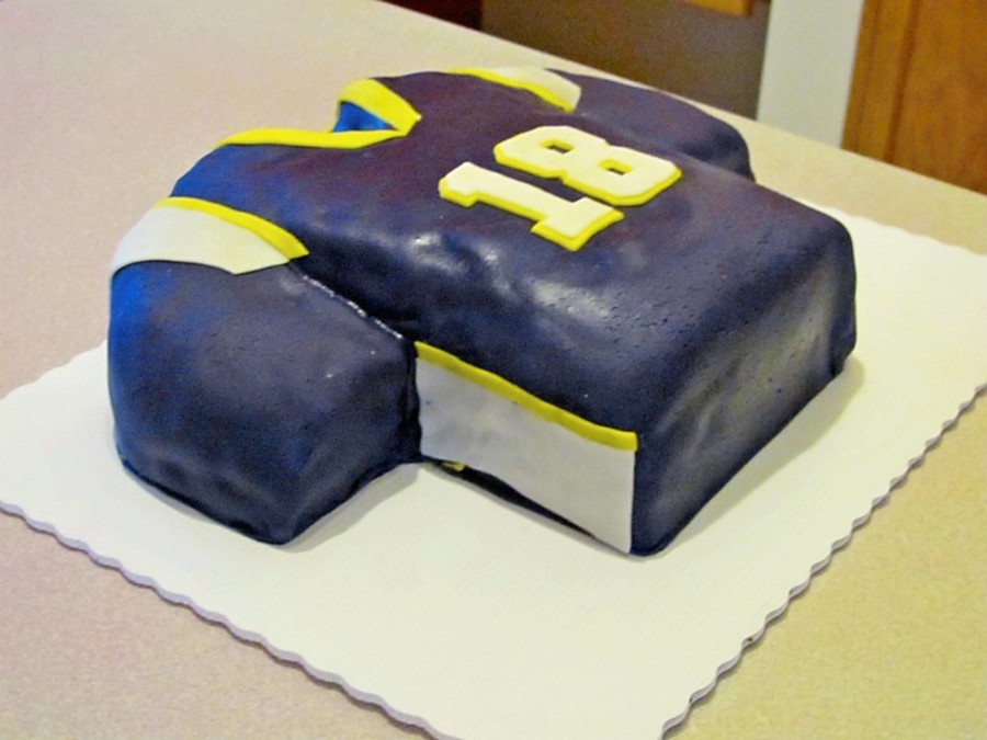 This was my first cake ever. It was way bigger than necessary. Gluten free chocolate cake with butter cream frosting covered in purple fondant that I bought. The white and yellow fondant was MM fondant that I made. I was too scared to pipe the small "Vikings" that the Vikings have on the front of their jerseys... The purple fondant tore a lot so it didn't go super great.