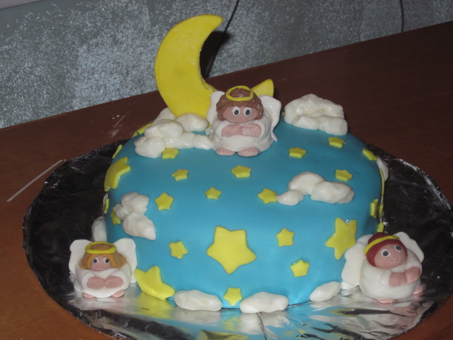 My first fondant cake! This was a devils food cake with chocolate ganache layers. I made it for my moms birthday! The angels were made of fondant and they did start to sag, thats why they are short and fat, lol!