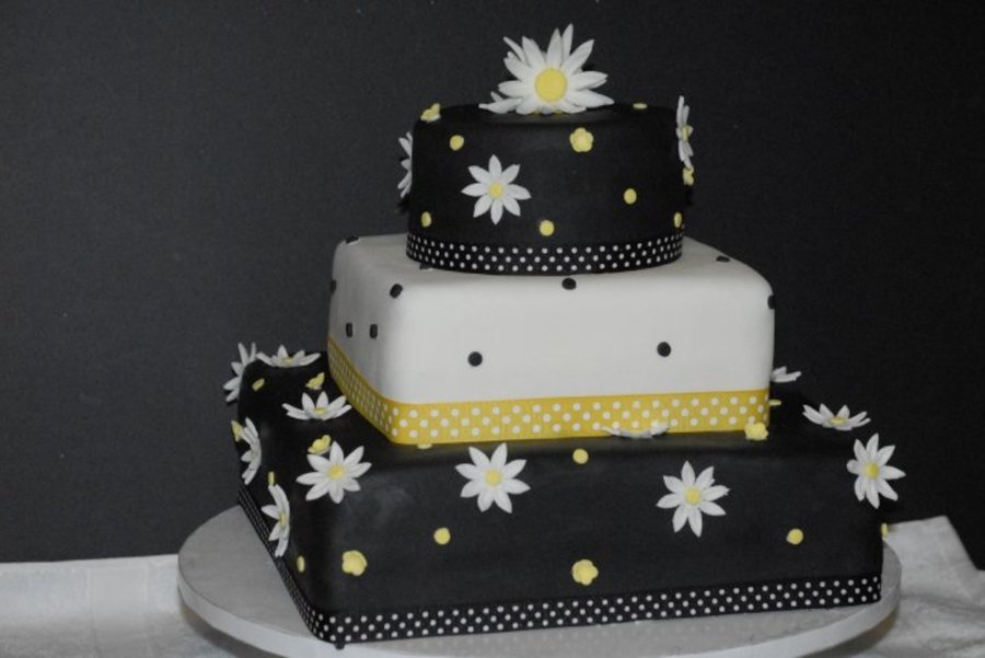 Bridal Shower Cake: Triple Chocolate fudge bottom layer with chocoloate buttercream, classic white cake middle layer with vanilla buttercream, triple chocolate fudge top layer with chocoloate buttercream. All covered with marshmallow fondant. Fondant flowers and dots