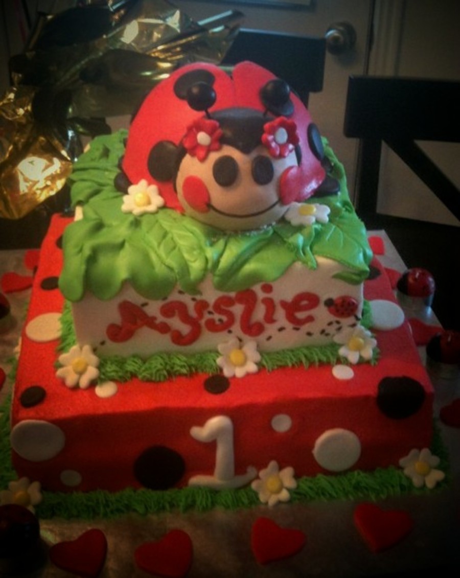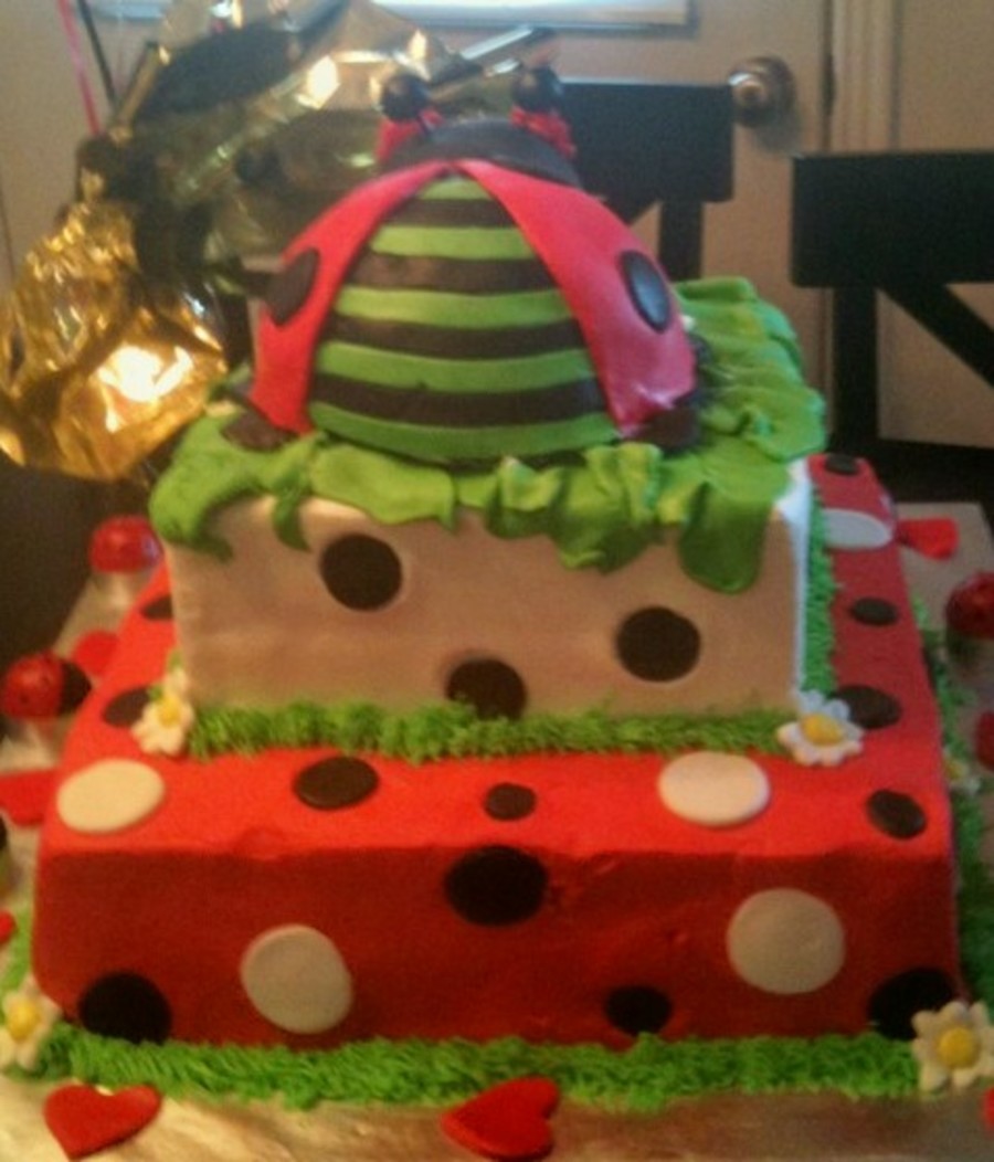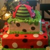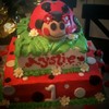 The ladybug cake I made for a friend's daughter on her first birthday. The ladybug was made from cake and everything was iced in buttercream icing with mmf accents.