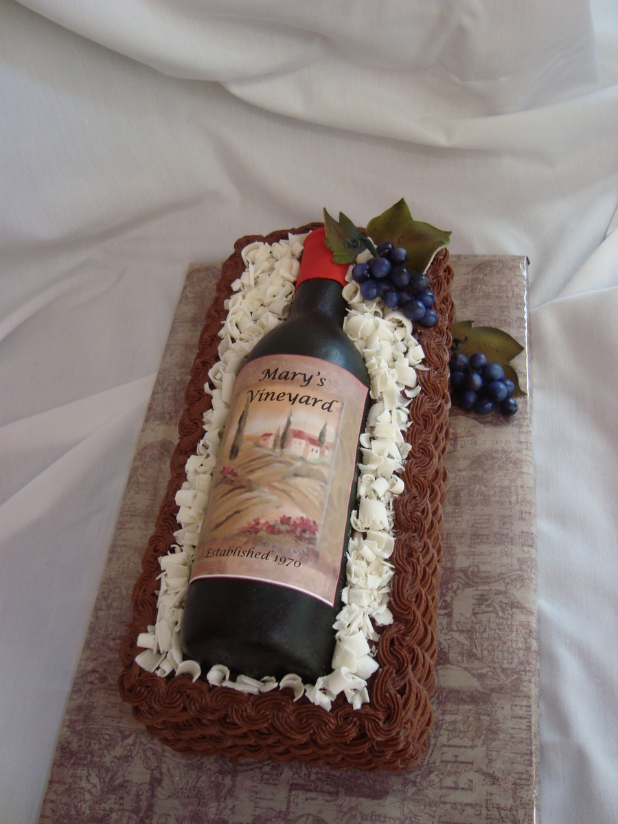 Gumpaste wine bottle on chocolate cake with choc buttercream for basket-- Fondant grapes and leaves.