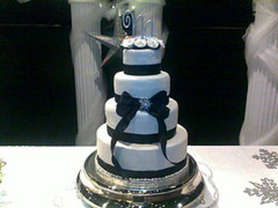 This is a four tier bridal shower yellow cake. White fondant with snowflake impressions and jazzed up with pearl dust. black satin ribbon on the bottom of each tier and the bow. snowflake brooch on bow and silver initial on top. black ribbon and white gumpaste roses on top. A string of pearls around the bottom tier.