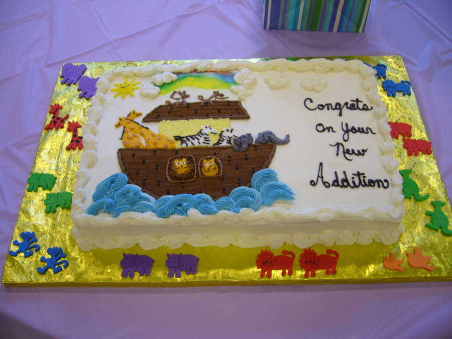 This was for a Noah's Arc theme for a baby shower. Yellow butter cake with buttercream. All designs buttercream. Foam animals around the border.