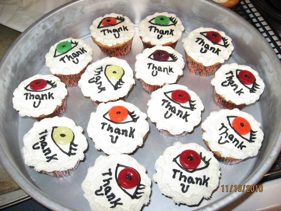 I did these for my son's 5th grade class. He recently had eye surgery and had to have a lot of help at school, especially from his class. They are all awesome. My son helped me design these (he is my biggest design helper). Lifesaver irises and black icing pupils. American BC icing. We did 30 of these.