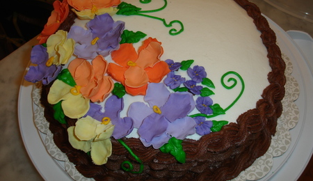 The full cake. YES I know there are structural issues. ;) I had to carve some overdone edges off because there was too much batter in the pan. Lesson learned I hope. YES yes I know the icing has bled through to the ribbon. *sigh* I honestly do know how to keep that from happening but didn't even think to do it so I'm ill about that.