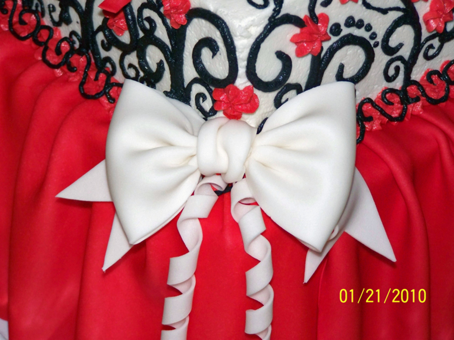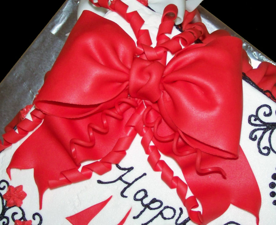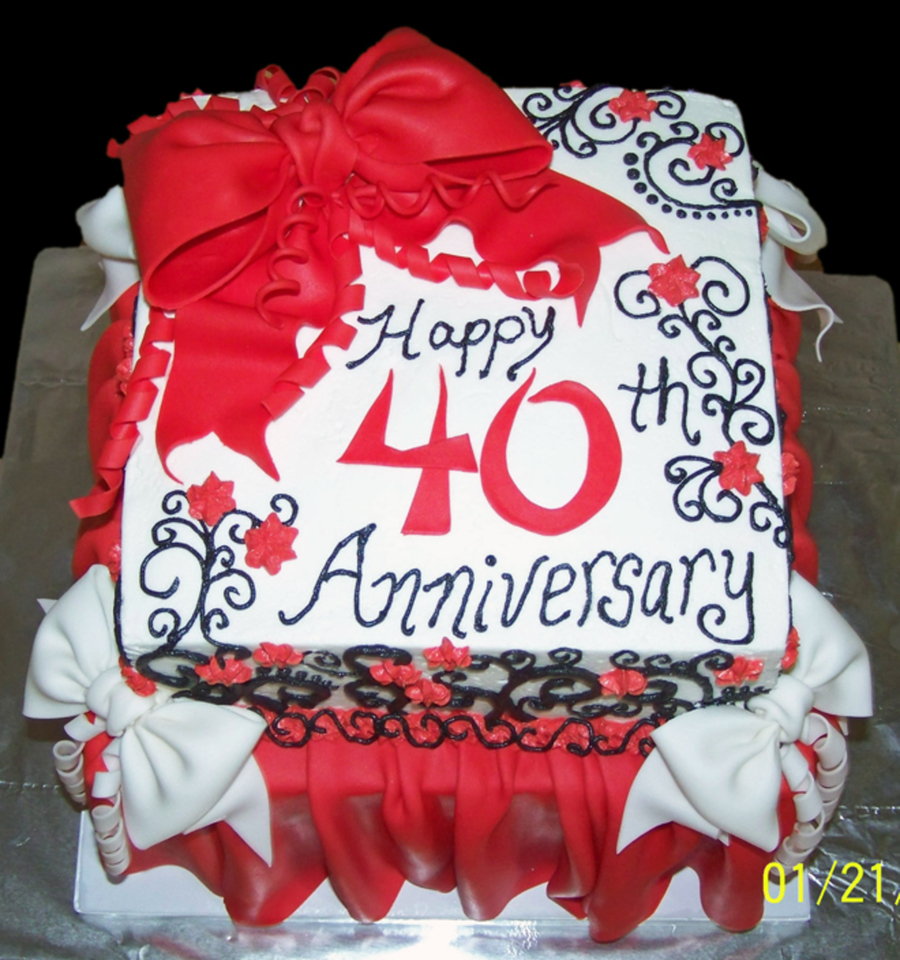 A friend of mine wanted me to make this cake for her parents. She was not too picky - she knew she wanted a big red bow, black swirls and red flowers. I came up with the rest. Cake is strawberry with strawberry cream cheese filling, frosted and decorated with buttercream. Bows, drape and the number 40 are made from gumpaste. Thanks for looking.