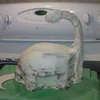 This dinosaur cake was made with a few supports and I detail the making of it on my blog. Chocolate cake body (carved from 9" rounds) and the tail, neck and face are molded cereal treats. The entire dinosaur is iced in vanilla buttercream, and the face and facial features are fondant. The rocks and leaves are fondant.