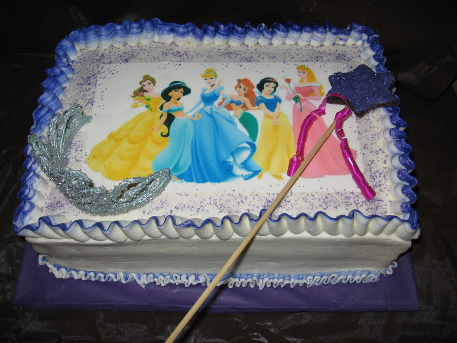 9 x 13 chocolate cake with chocolate chip cookie in the middle.Really made the cake too tall! Buttercream with edible image. Tiara is made with royal icing and wand is a chocolate cookie. Wanted to try a ruffle border, It's too big compared to the bottom, but I was running out of icing. For the most part I'm happy with it. Learned from it. TFL