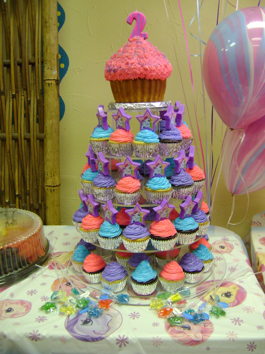 This is a cupcake tower I made for a friend's daughter. The large cupcake at the top is made with the Wilton cupcake pan.