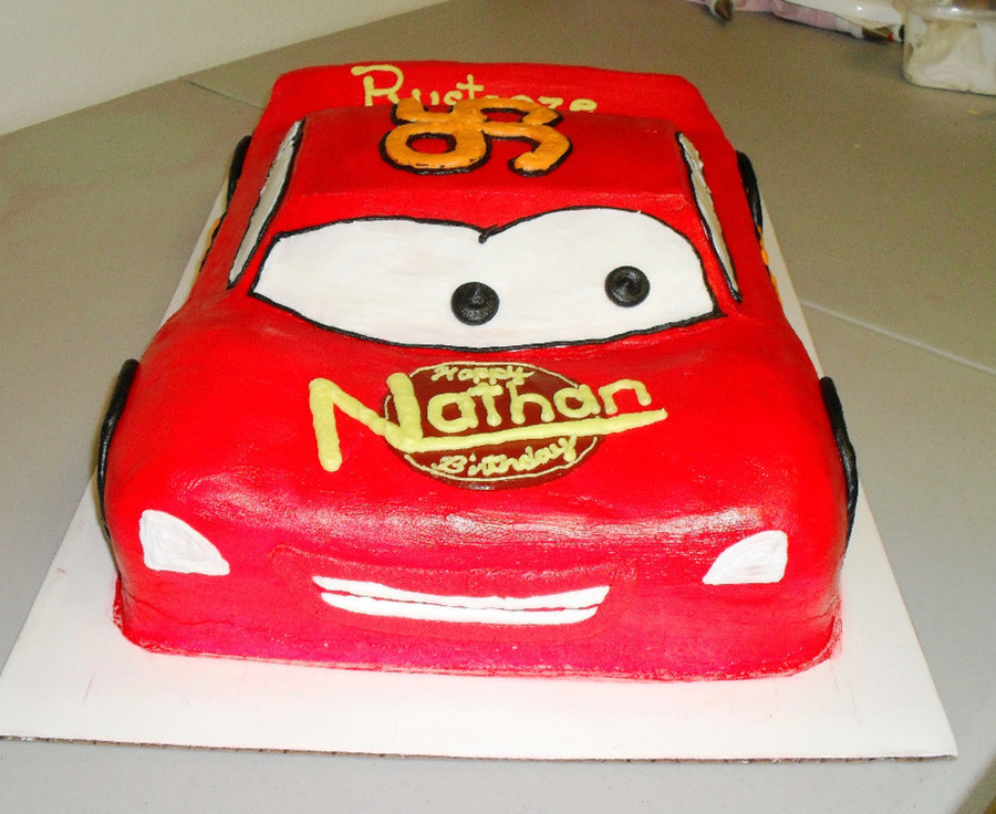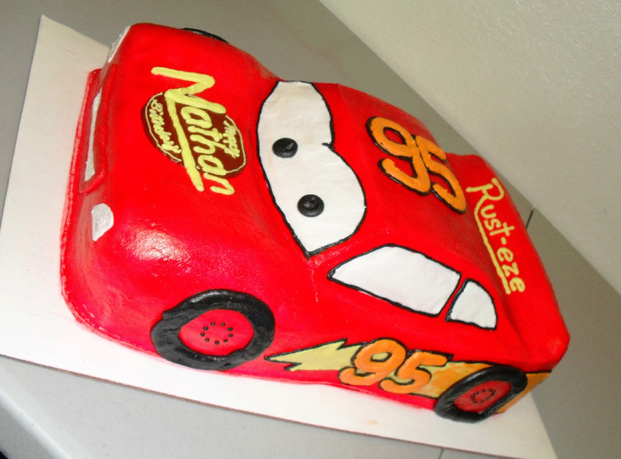 3D Lightning McQueen cake iced and decorated in buttercream.