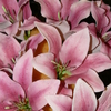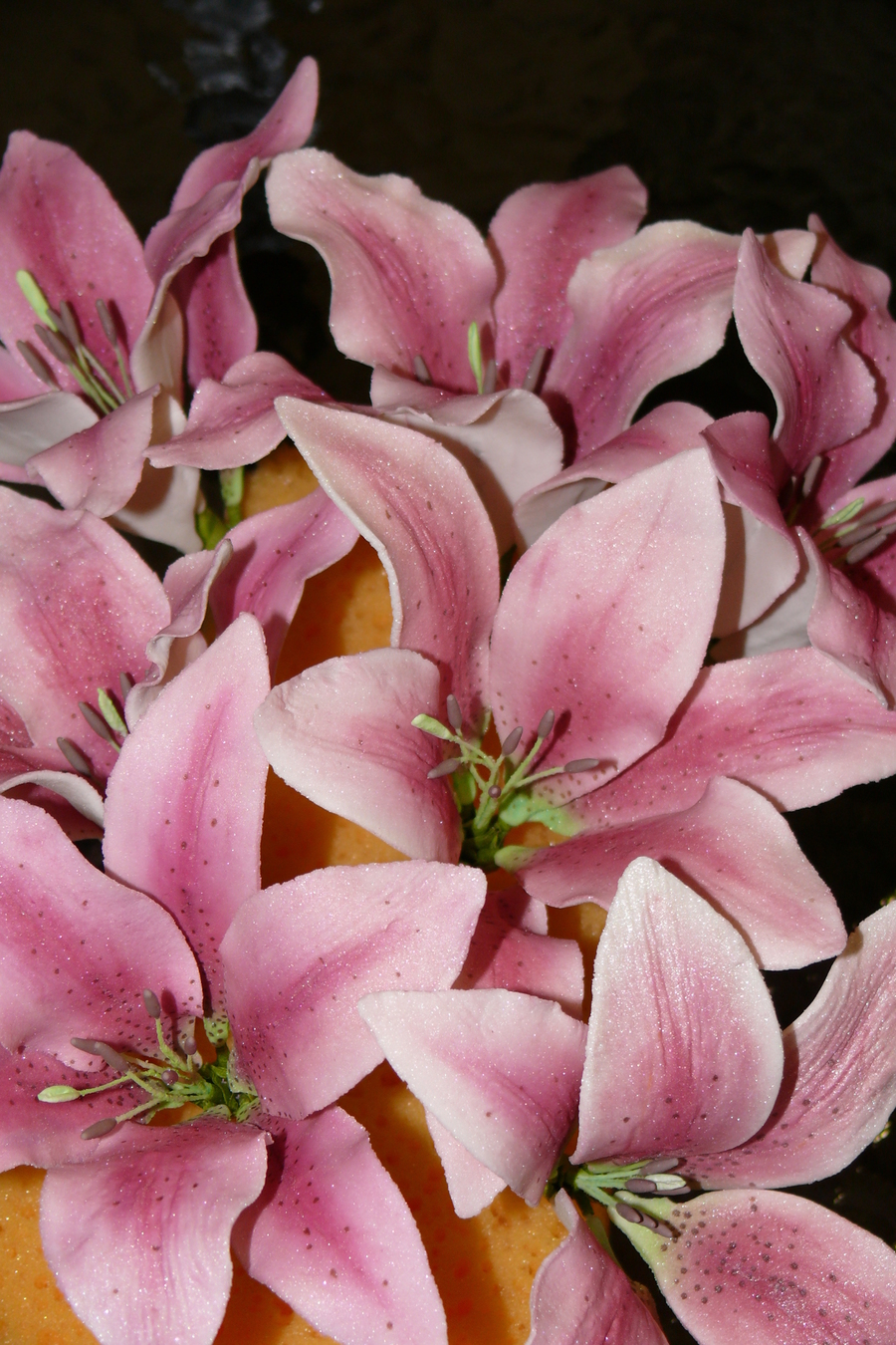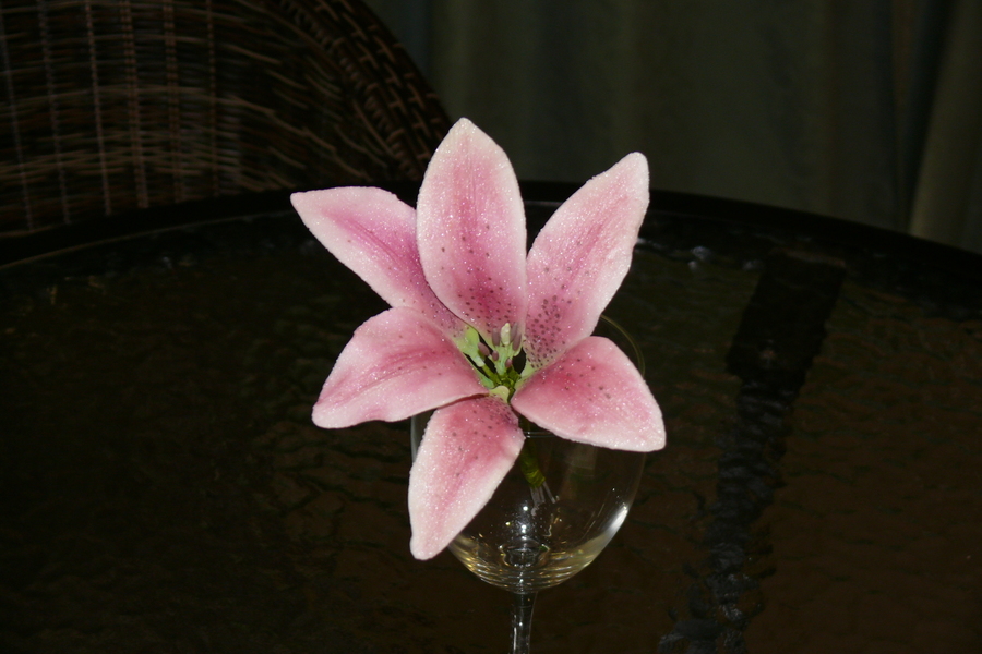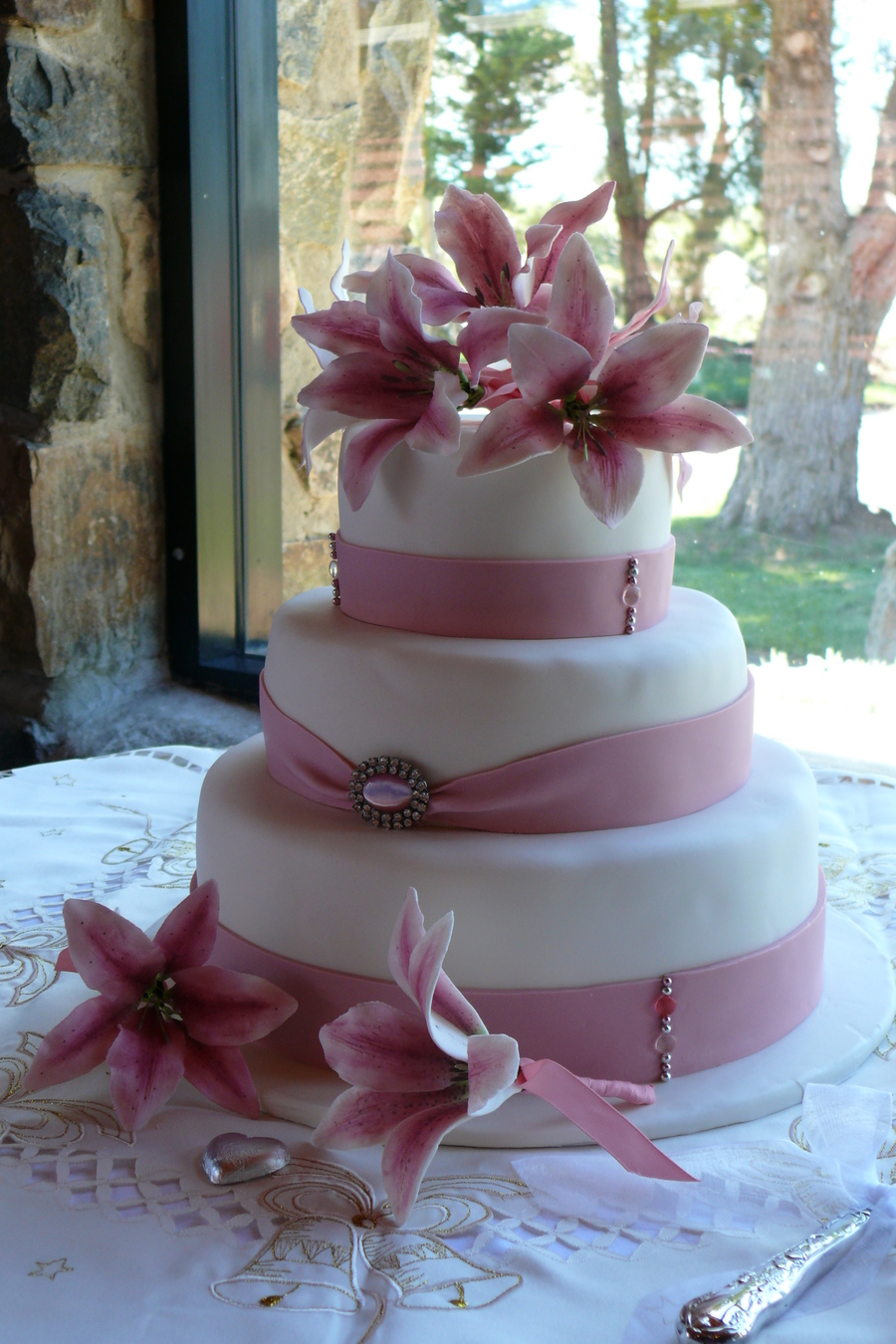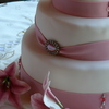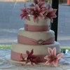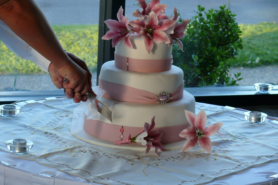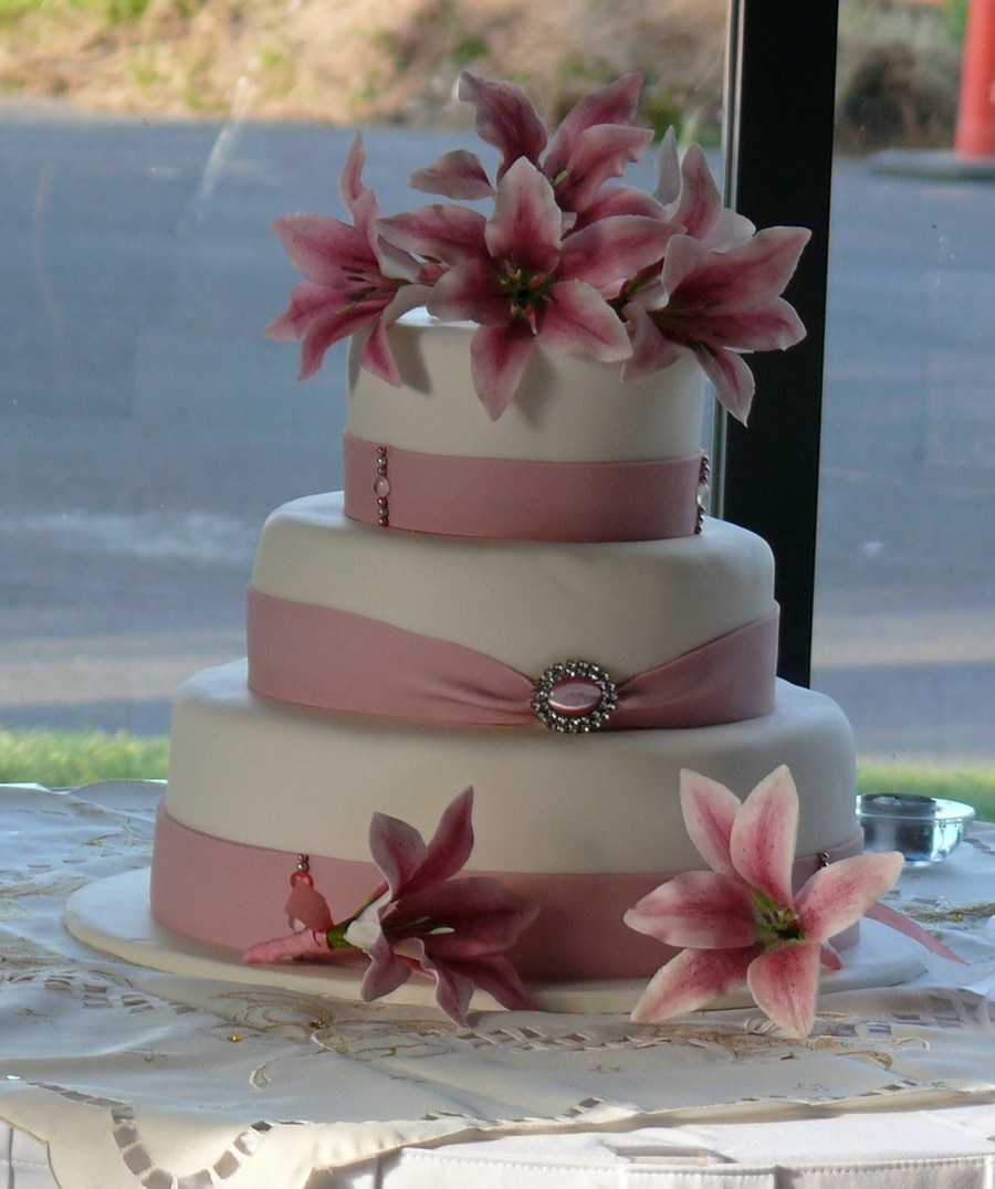 My first wedding cake - 3 tier with the bottom in Choc Mud, middle Caramel Mud & top White Choc Mud. All tiers were torted twice and filled with either a dark choc, caramel or white choc truffle. Covered with white choc ganache and ivory fondx. Decorated with pink fondant ribbon and finished off with cashous balls, sugar diamonds and 7 handmade gumpaste oriental lillies. Ribbon joined with diamante and pink catseye brooch.
