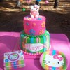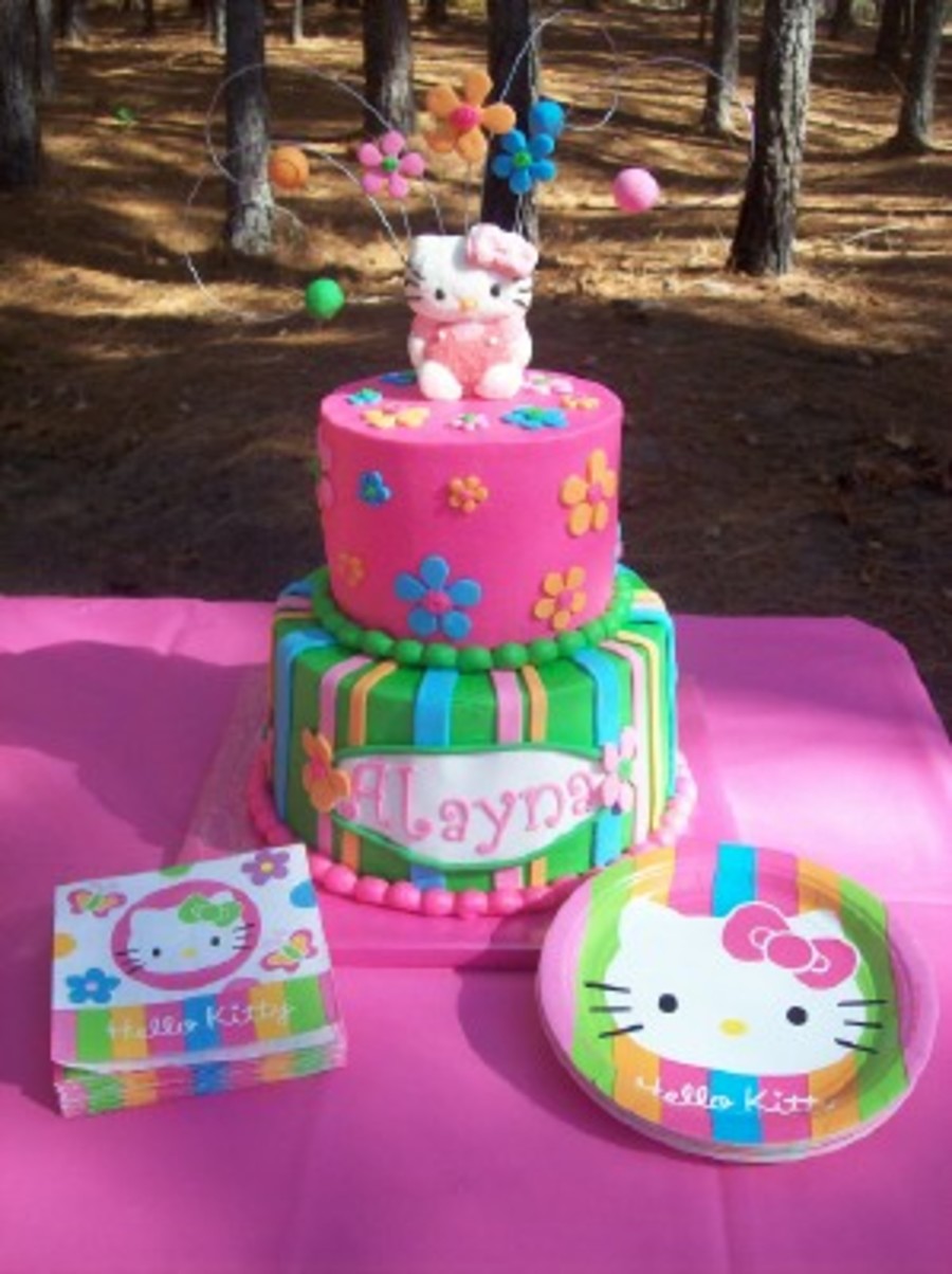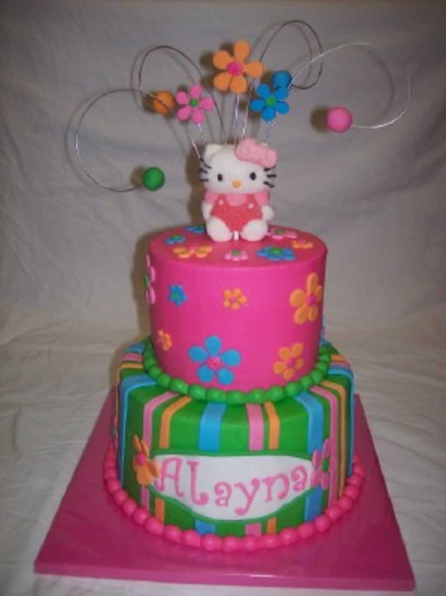 This was for my daughter's 3rd birthday. Buttercream with fondant accents and a Marshmallow Hello Kitty lollipop.
