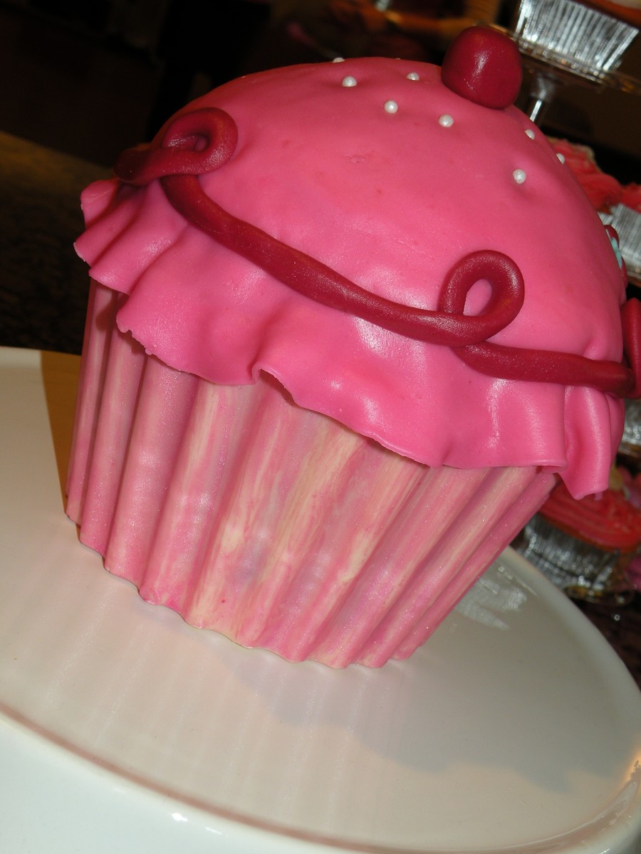 White chocolate mold on bottom, used a combination of a giant cupcake pan and half of a ball pan. Chocolate cake, chocolate cream cheese filling, strawberry fondant. Thanks to Destini's tutorial explaining the process for making the wrapper!