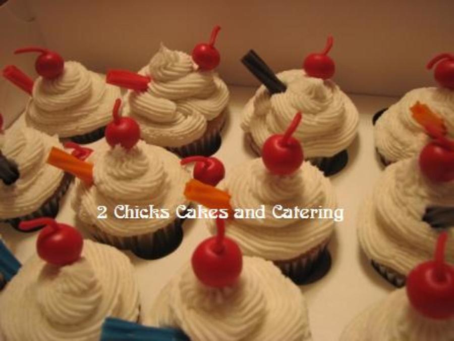 Rootbeer WASC for the cupcakes, vanilla buttercream, Twizzler "straws," and Duff's fondant for the cherries. If you haven't tried the rootbeer WASC, you really should. Yum!