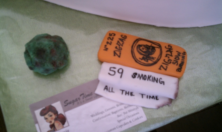 this was a cake made covered in fondant and zig zags were gunpaste i dusted the corner to look like it had been burned with a litle green bud ant the tip of the cake was dusted with silver , red and black disco dust to make it look as if it was burning wih the added medicinal card..please coment tfl...
