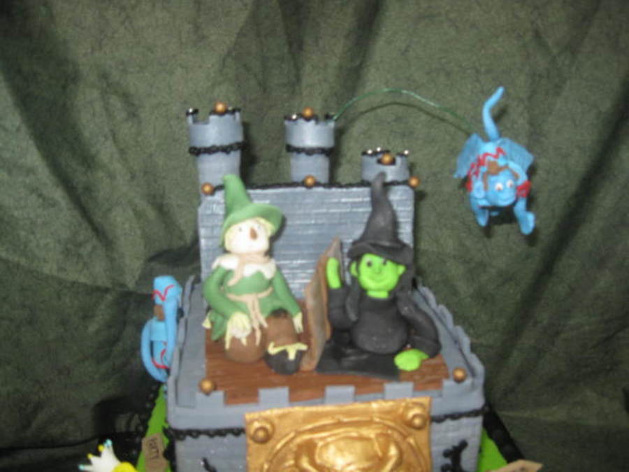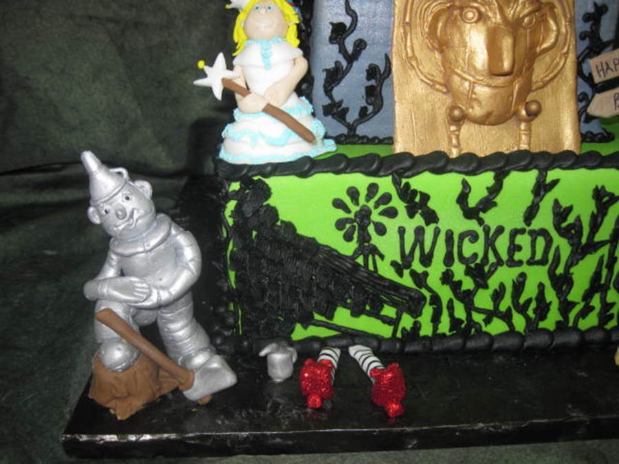 CSM: marble cake with buttercream and fondant icing. They wanted it centered around the musical Wicked and Wizard of Oz, so I made the figures and tied in both. All figures are hand modeled- I was so proud to see that my monkey actually held up enough to fly!! :) Thanks for looking and for your comments!