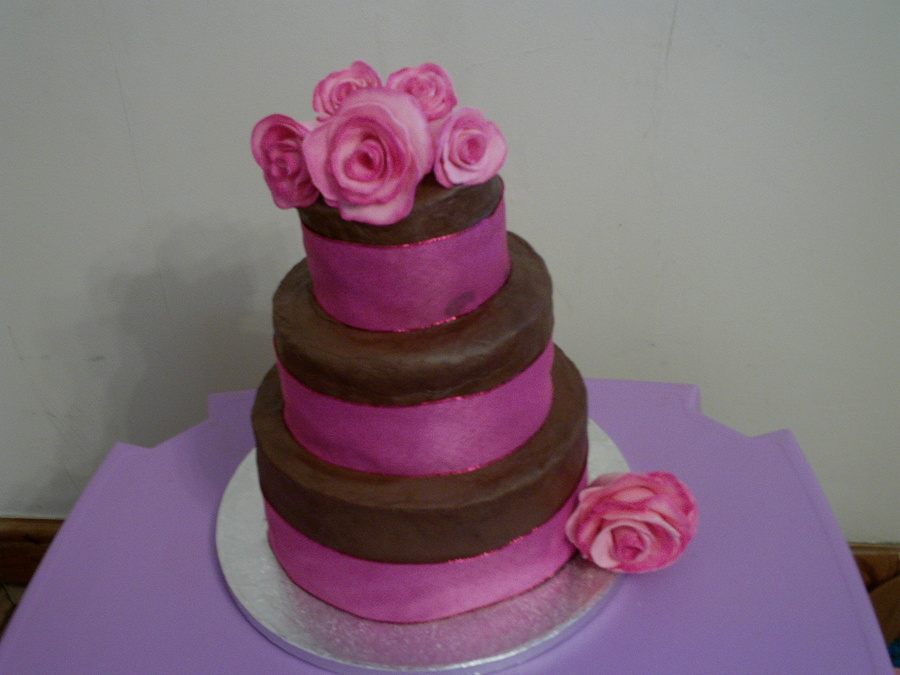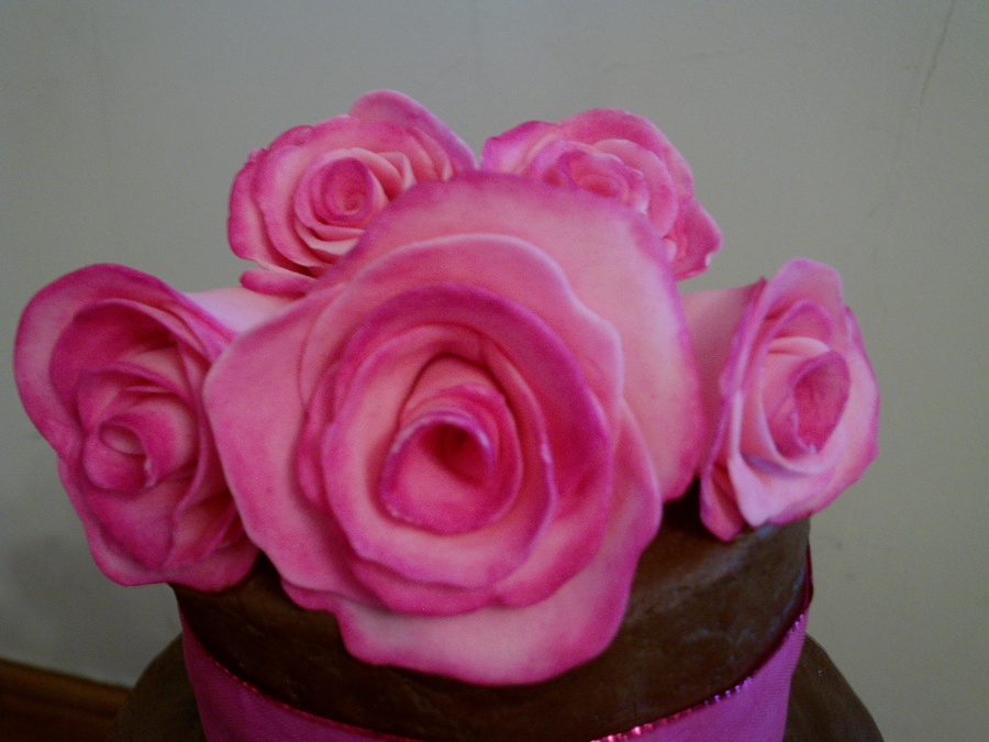 Chocolate cake with a rich chocolate fudge icing topped with home made sugarpaste roses.
