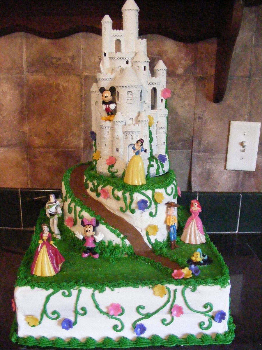 buttercream cake with fondant accents..the disney characters are all pvc and the castle is an incense burner i found at walmart..thought it would look cool on my kids disney party cake..i really wanted to try to make a winding road cake and was pretty happy with the way it turned out!!
