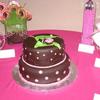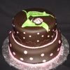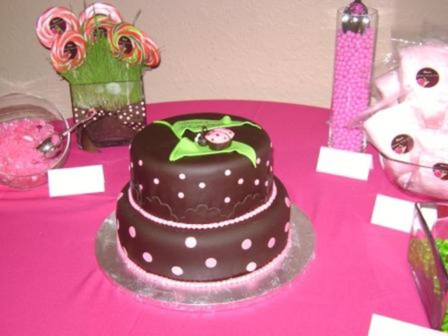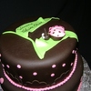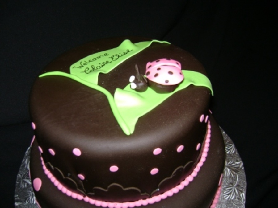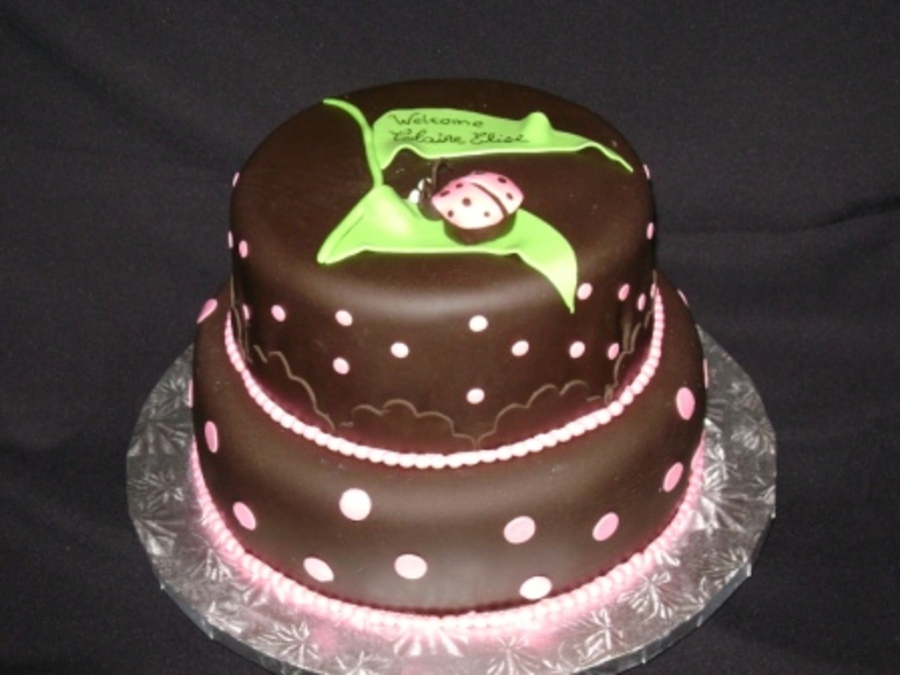Lady bug baby shower cake. Both tiers vanilla cake, bottom with guava filling, top with apricot filling. Covered with vanilla BC and chocolate fondant. Decorations in fondant.