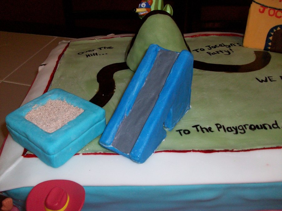 This was a birthday cake for my niece's 3rd bithday. It is a 3D "layout" of the map, and how Dora and Boots need to get to "Jocelyn's Birthday Party". I hand made Map out of fondant.