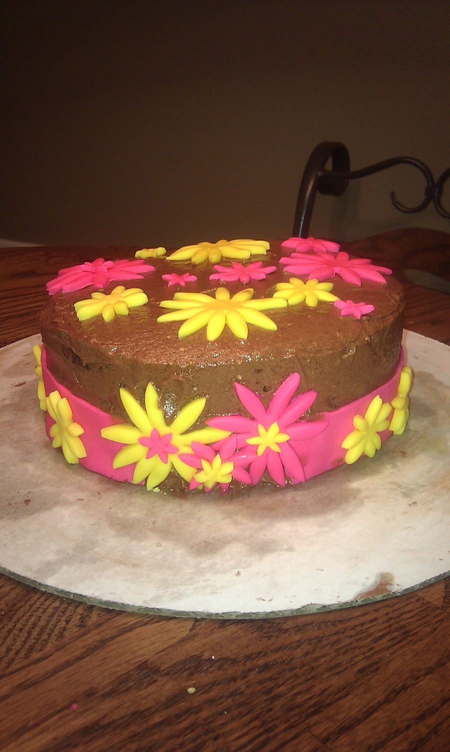 chocolate fudge cake, with chocolate buttercream icing, and mint buttercream filling. Flowers made out of fondant.