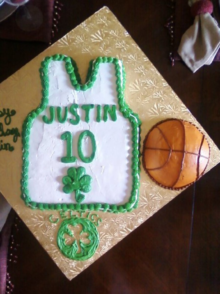 This cake was made for my 10yr old's birthday. The cake is a Boston Celtics Jersey with his name and age on it, made out of a 1/4 sheet. The side cake is a basketball made with the ball pan. The decorations are all bc. tfl