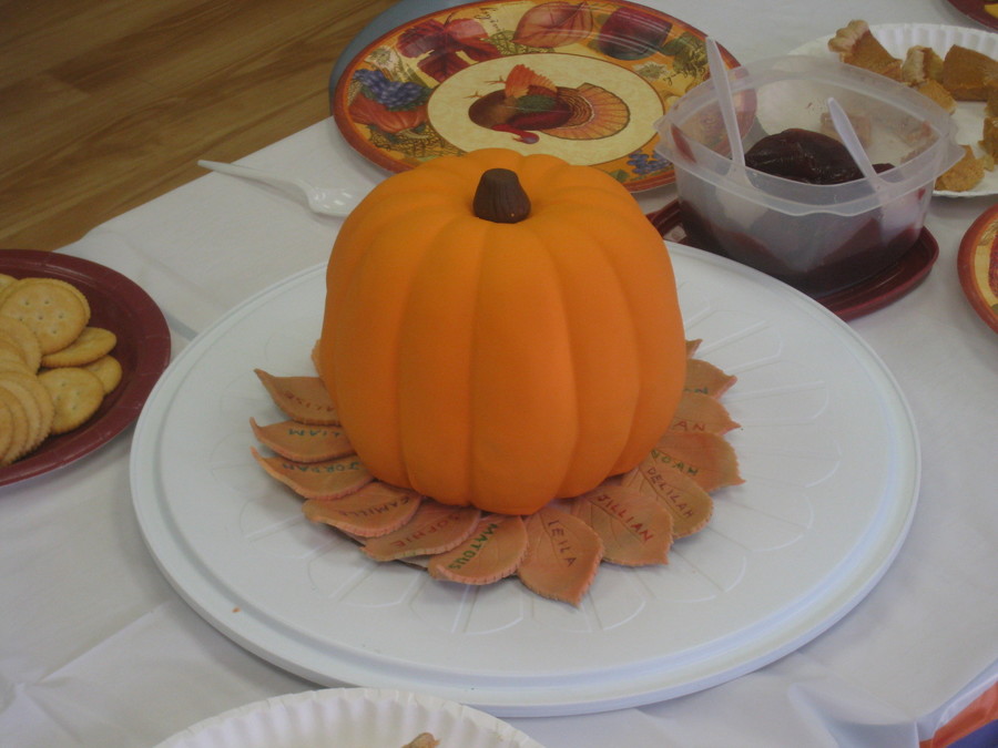 Used aztomcat's Heavenly Pumpkin Spice Cake recipe for this cake. Made for my son's class for their Thanksgiving feast. Leaves made of a mixture of fondant and modeling chocolate - a leaf for each child in the class.