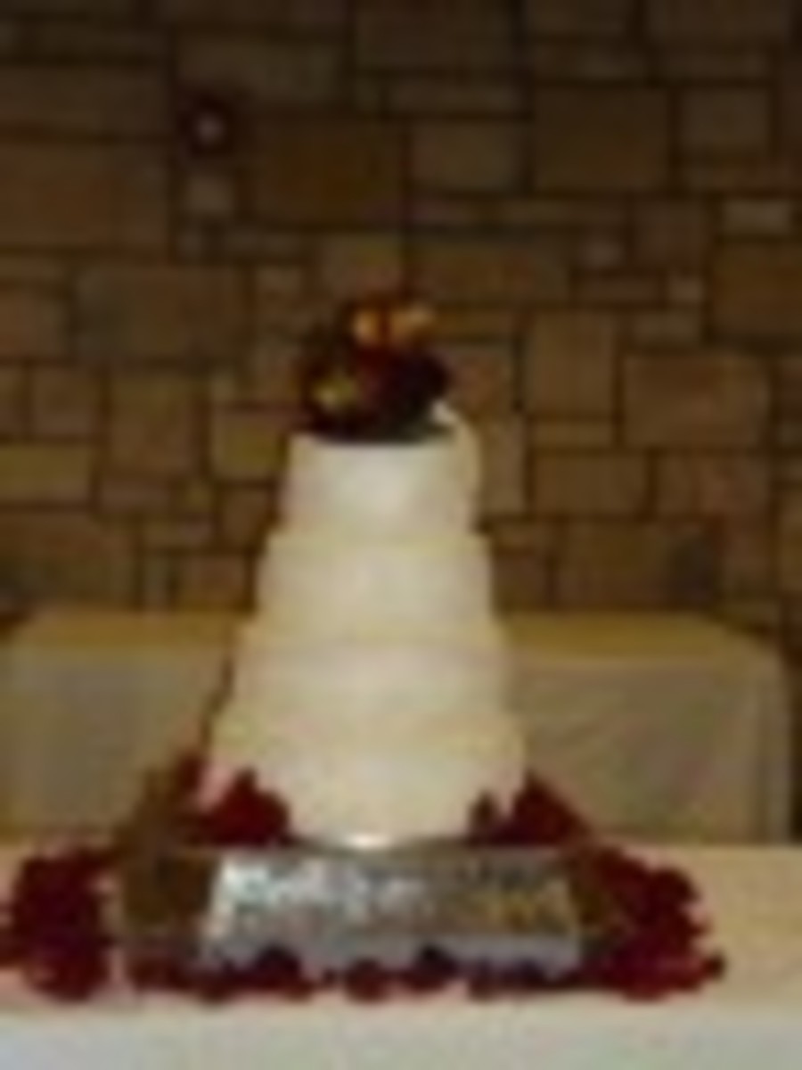 This was my first wedding cake. It is a 14"12"10" & 8" white cake with chocolate ganache filling, white chocolate ganache and rasberry fillings. Fresh flowers on top and around base.