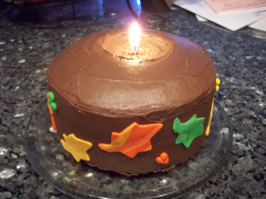 Chocolate cake with chocolate frosting and fondant leafs. First attemp at a candle cake. It turned out ok.