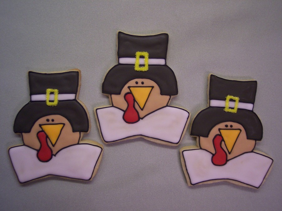 This design came from an applique patch I saw at the fabric store. I wasn't going to do Thanksgiving cookies, but he was too cute to pass up! Sugar cookie decorated with glace icing.