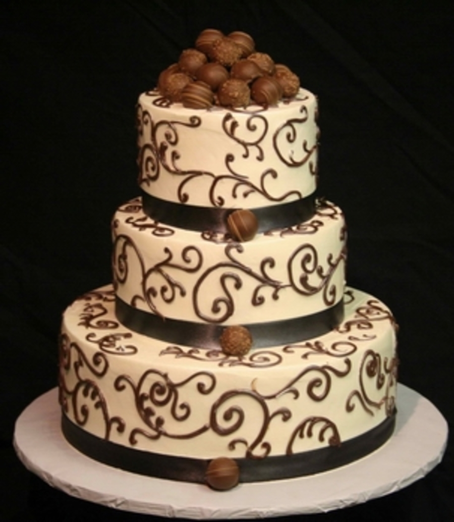 This wedding cake is iced in chocolate buttercream and decorated with fudge scrolls and yummy Godiva truffles!